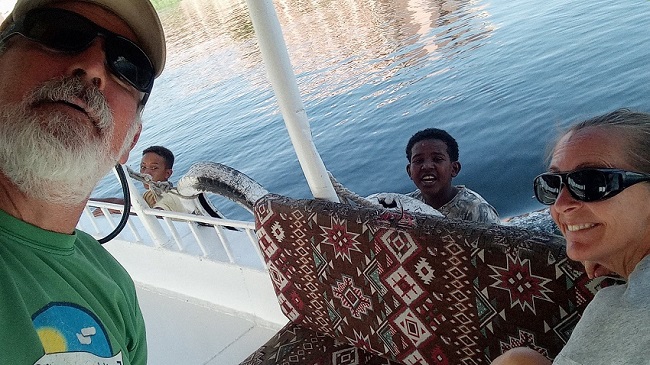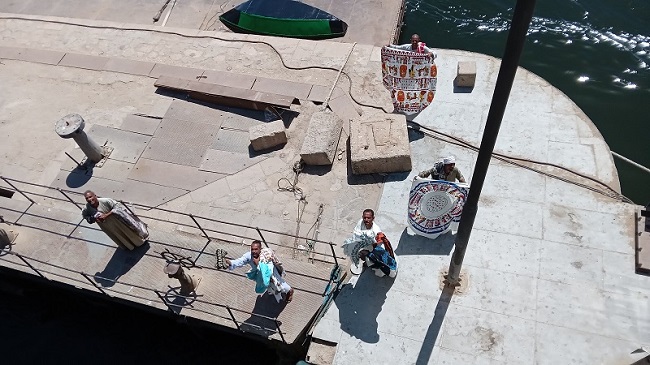 Men are so desperate to make a sale on the Nile River in Egypt between Luxor and Aswan that they stand at a river lock and throw blankets up onto cruise ship decks. They hope a tourist will send money down in return. Instead, the tourists on our boat threw all the blankets back down. Imagine you’re so hopeful to make a sale you risk losing your merchandise if it lands in the water on the toss back.