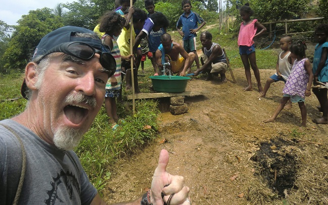 First we build a henhouse that had been destroyed by a typhoon a couple of months before the pandemic that had not yet been rebuilt. Next we brought electricity to Kurong Village – at the top of that small mountain in Malay. Homes suddenly had light at night. People could charge a cell phone, play music. And then we installed a water pump with the new electric source that brought drinking water to the top of the mountain.
