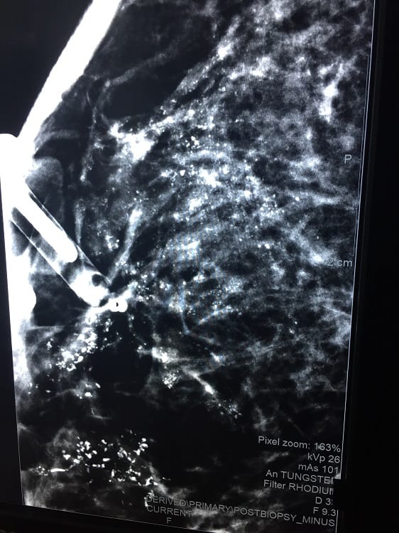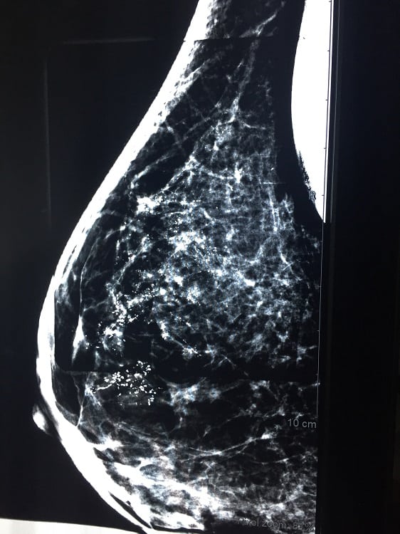 My 3D mammogram revealed a large area of suspicious pleomorphic microcalcifiations. A biopsy was recommended as soon as possible.