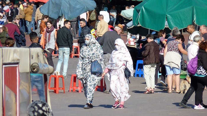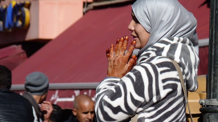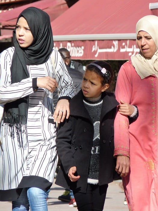 Many women wear the traditional head coverings, such as hijabs or burqas. Some people believe Islamism demands women cover their hair. Other people believe there is no such demand. In Marrkesh, you see – women in head coverings and women without head coverings, both inside and outside the medina, or old walled city.