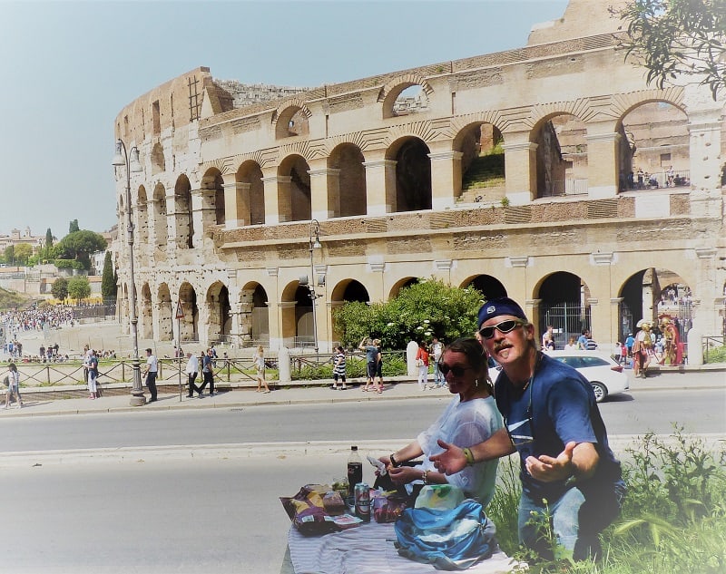 As budget travelers, we often bring snacks to our sightseeing tours and take breaks in parks. This time, we loaded up with a full meal at a nearby grocery store, and Tedly found a great spot overlooking the impressive ruins of the Colosseum and part of the Roman Forum.
