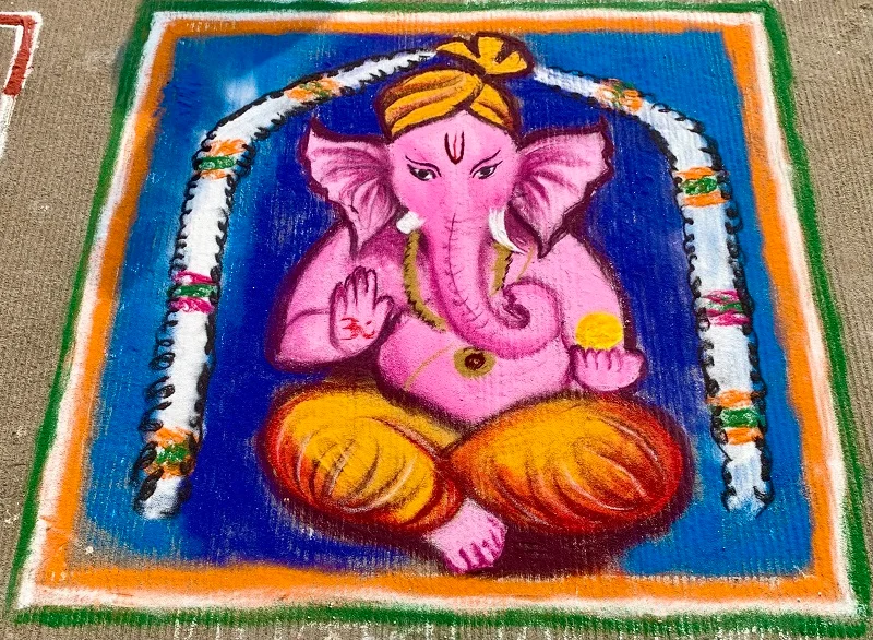 The second and third place winners are pictured below, respectively. These images are more traditional kolams with predominant geometric designs. Note another variation of Ganesh in the second place kolam.