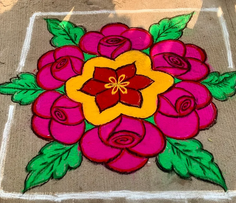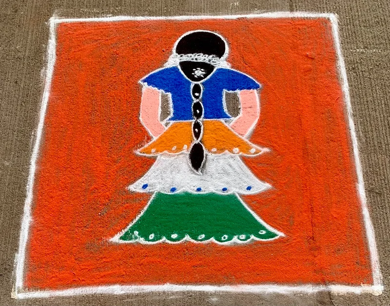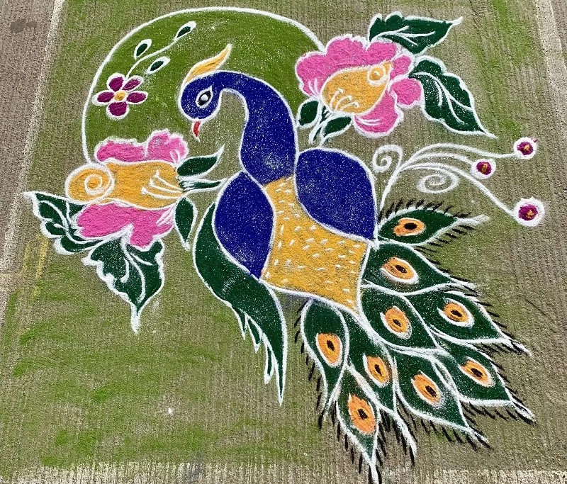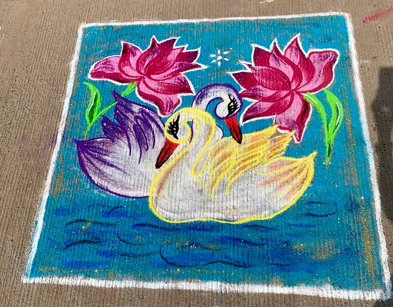 In modern times, kolams feature gods, birds, flowers, etc. — often in a geometric arrangement in colors as vibrant as India Herself.
