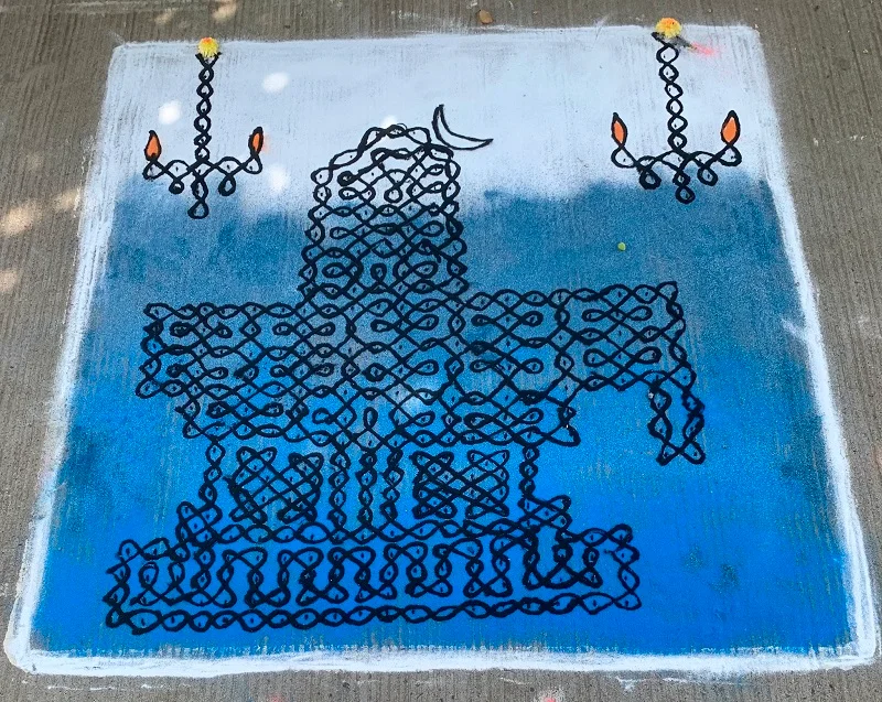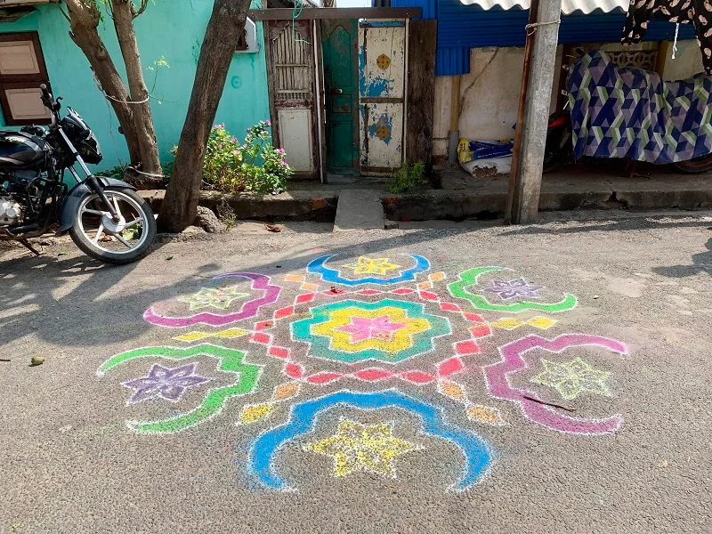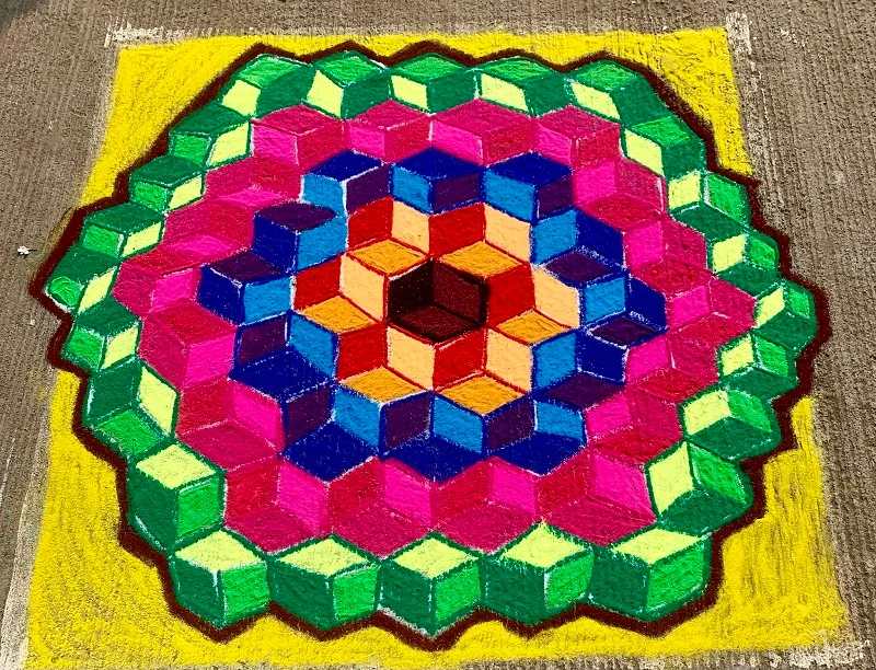 Kolams also serve as reminders about the universal law of impermanence. Traffic, pedestrians, animals, insects, and elements erase the powdered artwork, so the drawings must be redone every day. But it’s deeper than that: impermanence teaches acceptance of change and detachment from material attachments.